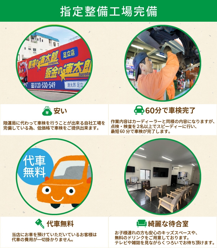当社の自社工場は、全国展開の車検ブランド「車検の速太郎」の足立店として年間5,000台の車検を実施しております。これは、足立・葛飾・荒川・江東・墨田・台東・八潮市・草加市等のエリアでもトップクラスの実績です!